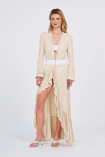 Romantic and versatile, the Long Sleeve Ruffle Maxi Dress redefines long beach cover up dresses with its balance of elegance and function. Crafted from lightweight UPF 50+ fabric, it keeps you cool, comfortable, and protected from the sun. Offered in sand-toned beige and classic black, its flowing ruffle details and long sleeves provide graceful coverage, while the button-up design lets you style it closed for sophistication or open for a breezier look. Perfect for sun-soaked destinations, this piece brings effortless luxury to the world of long beach cover up dresses — from the shoreline to sunset cocktails.